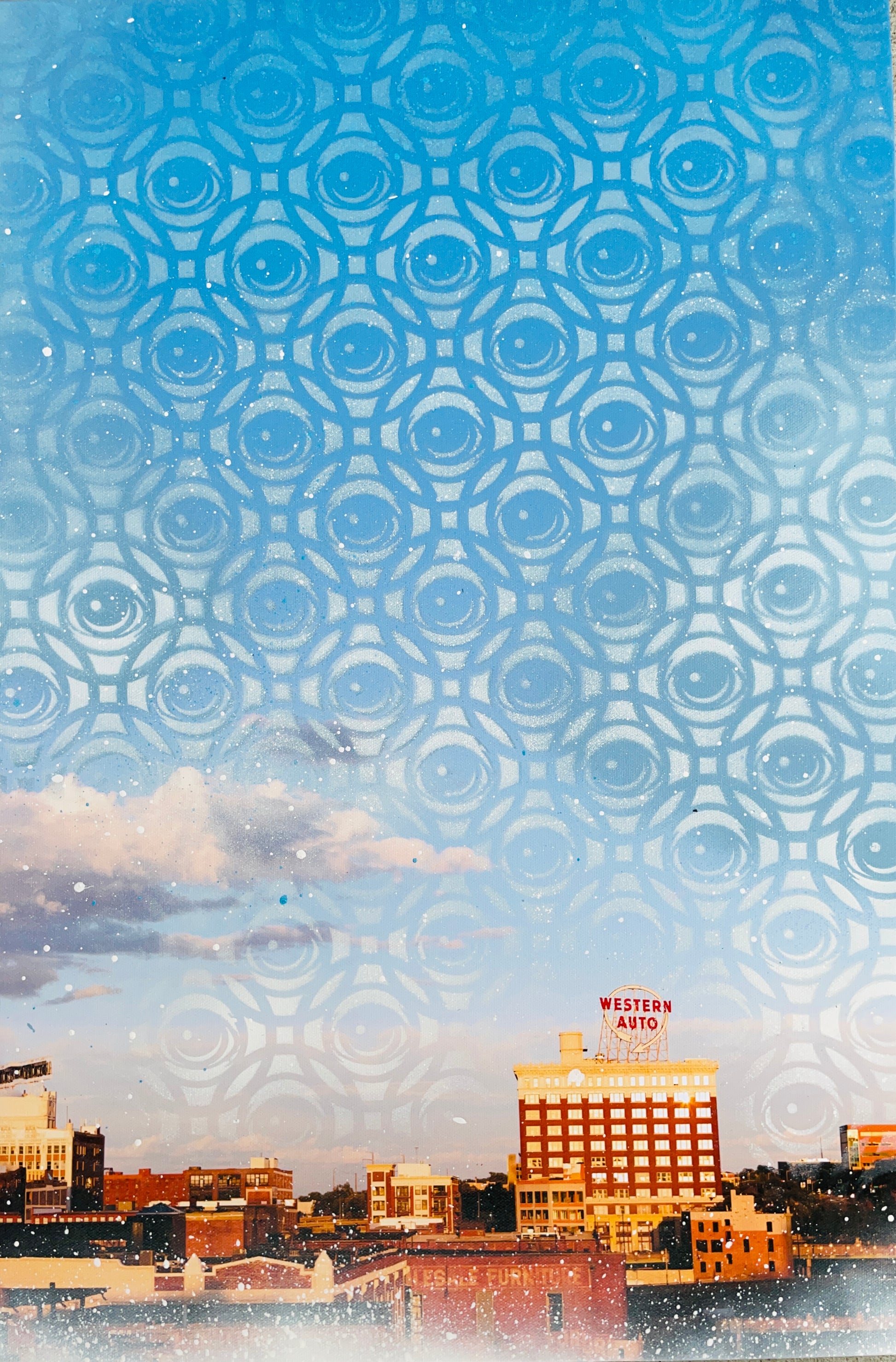 @Eyez Collaboration with @alexlikeaboy Alex Rhoades on a Photo Canvas on a landscape she photographed and printed on Canvas, that Eyez painted a pattern from a mural he produced for Spray See Mo where he connected with Her on this piece.