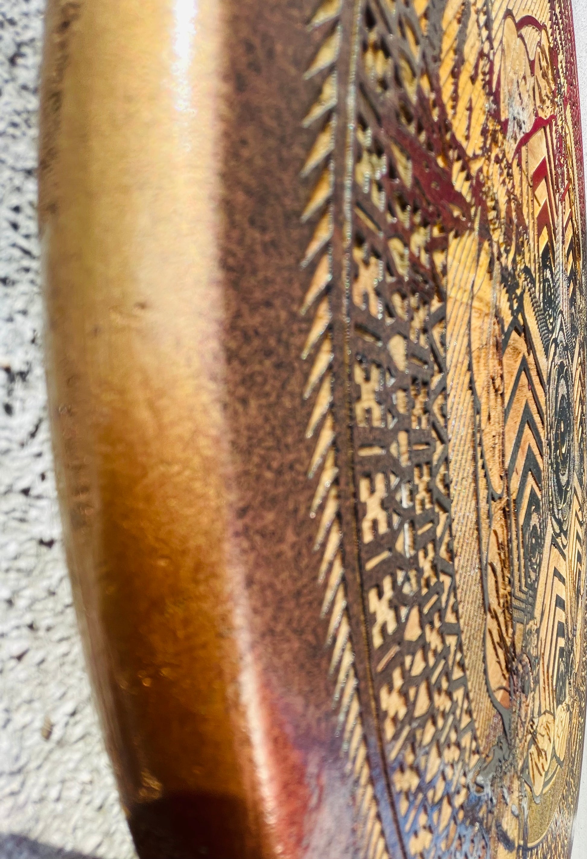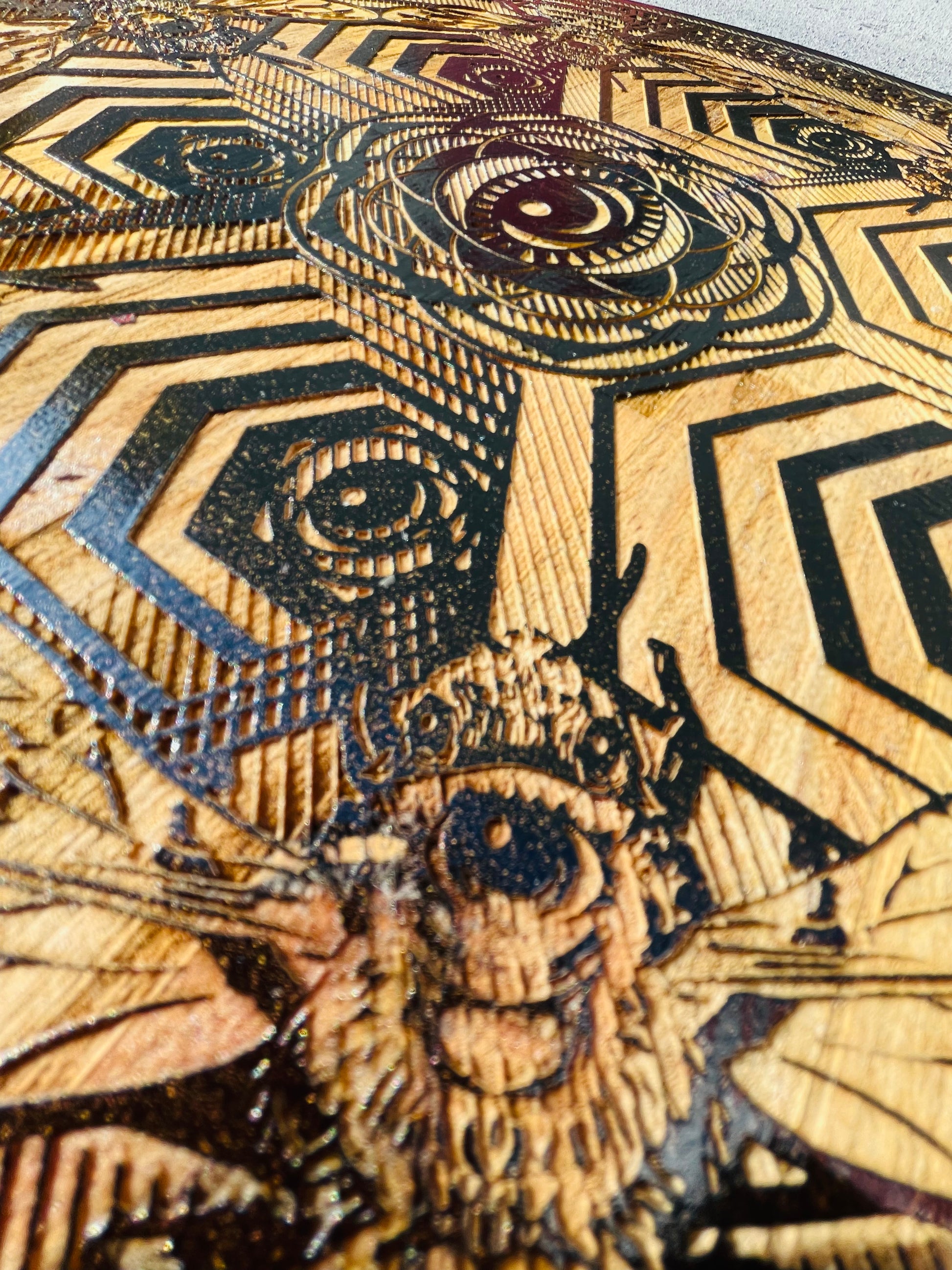 18 inch round wood panel engraved with a Bee Mandala design. This is painted with metallic paints and engraved. Signed on reverse.