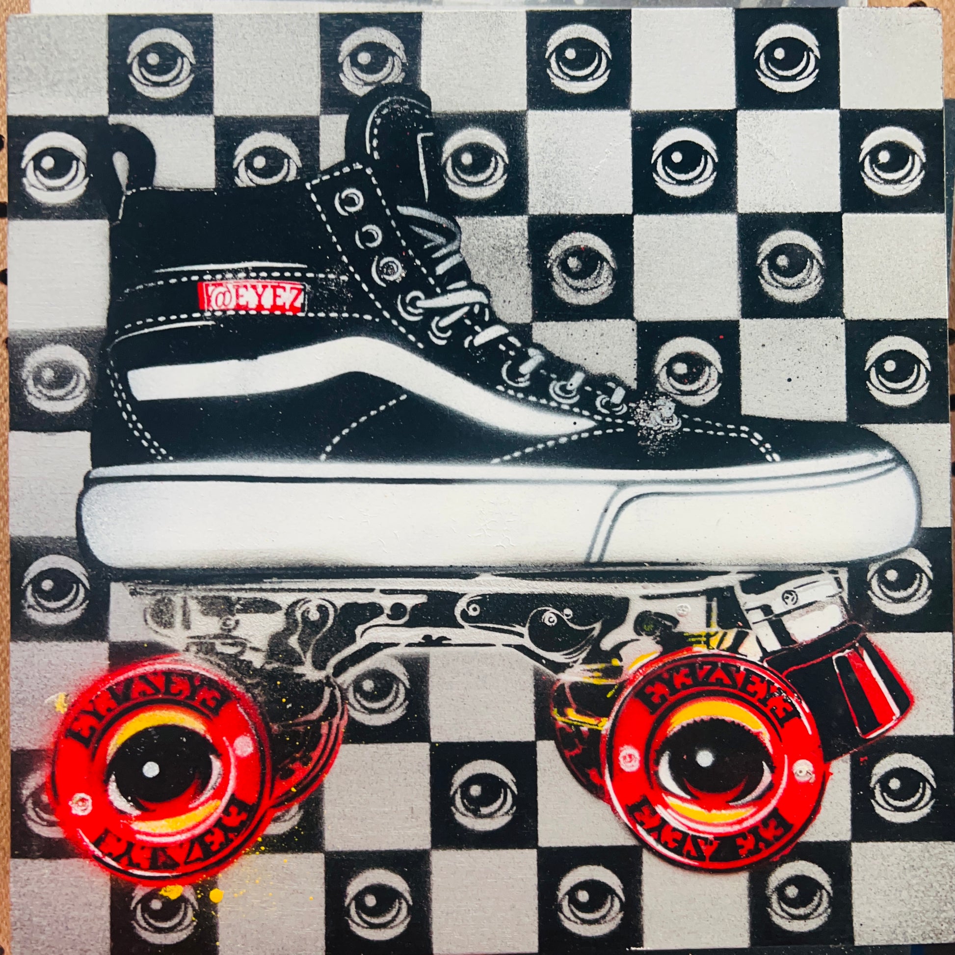 Eyez loves to sk8 with his custom vans quads and captures them in this original work! This wooden spray-painted 12x12 inch wood panel will look EYEmazing on your wall and for that skater in your life!
