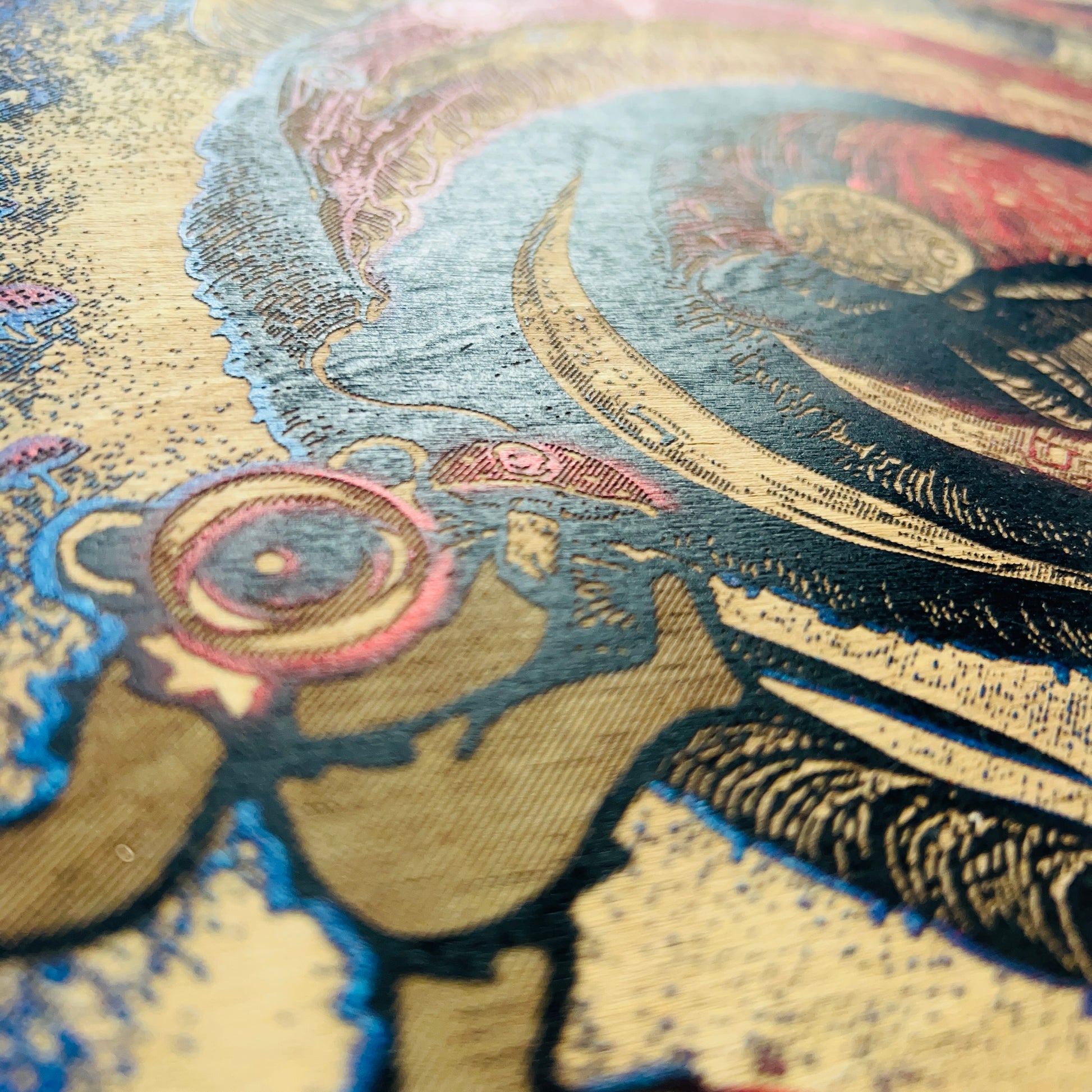 This wooden spray-painted 12x12 inch heady panel will look EYEmazing on your wall! The work utilizes UV sensitive Paint for a unique visual appeal that glows under a black light!