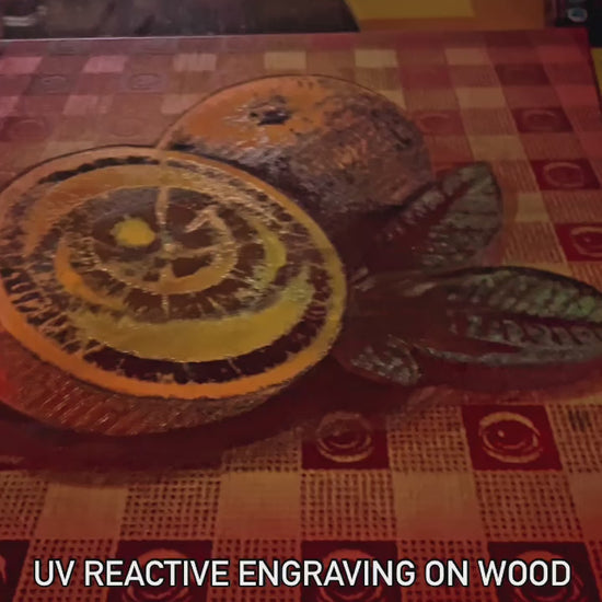 Orange you gonna ask me about my Eyez? This wooden spray-painted 12x12 inch wood panel will look EYEmazing on your wall! The work utilizes UV sensitive Paint for a unique visual appeal that glows under a black light!
