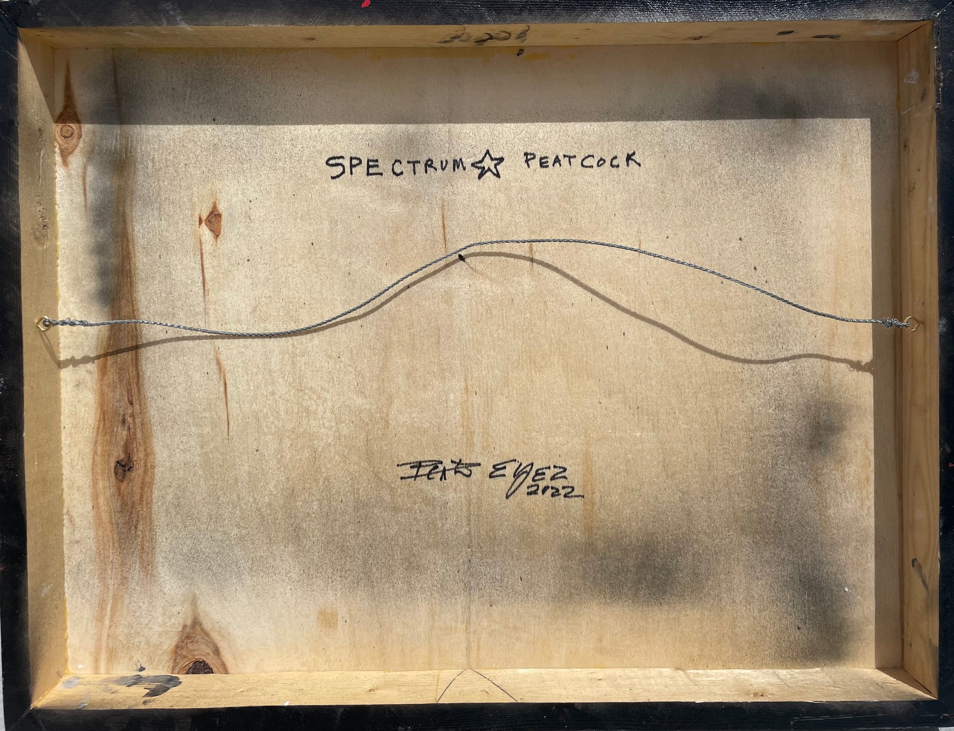 Eyez spirt animal is the Peacock 🦚 even tho he does not have tattoos he struts usually in very bright colors just like the Male Peacock, and is his inspiration for this Painting. This painting is on 18x24 inch wood cradled panel. This is also based off of his mural that he painted in Wynwood during Art Basel 2021.