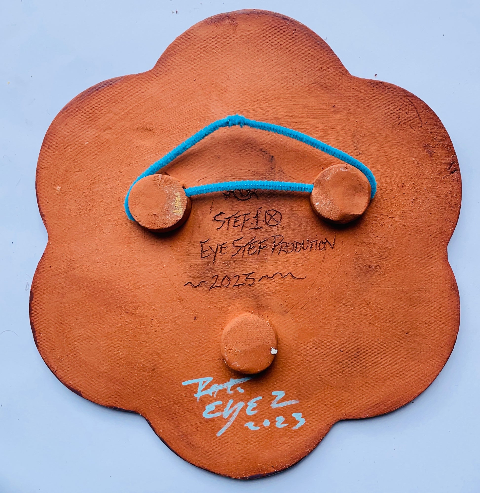 @Eyez Collaboration with XMEN Queen Stef Skills on a clay medium where she asked him to make a stamp with his Laser. She sent him a sketch then he eyed it up and did a 5 hour engraving on plexi and then traveled to Chicago to deliver it to her. She then pressed the image in to clay and hand-painted glaze on and the fired the piece to create a one of a kind collabs for the Chicago Exhibit.